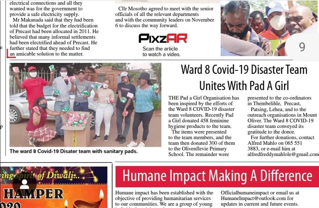To assist disadvantaged school girls and orphanages with sanitary pads;